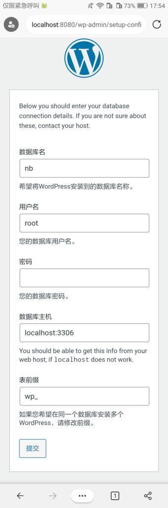 然后填上信息。数据库名填刚才创建的数据库名,用户名填“root”,密码为空(如果修改了密码就填新的密码),数据库主机填“localhost:3306”(更改过端口的将“3306”改为更改后的端口),表前缀保持默认,之后提交。
