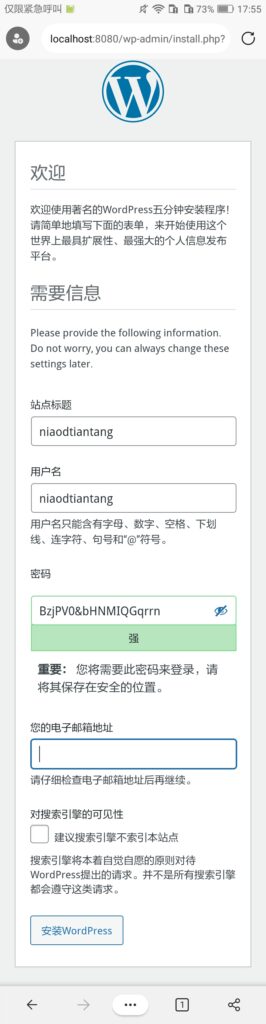 输入站点的信息和管理员邮件、用户名、密码,然后点击“安装WordPress”。